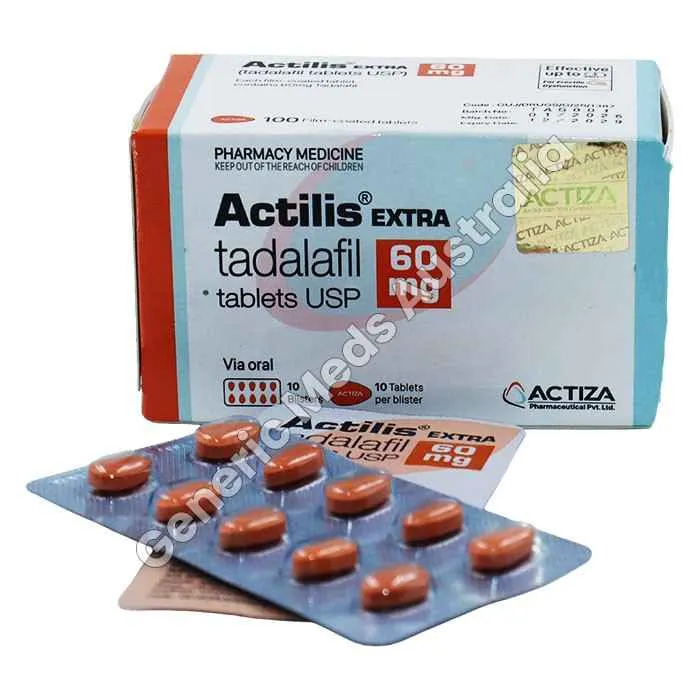 Actilis Extra 60 mg Tablet (Tadalafil) helps treat erectile dysfunction by improving blood circulation, supporting firm erections, and providing long-lasting sexual performance and confidence in men.